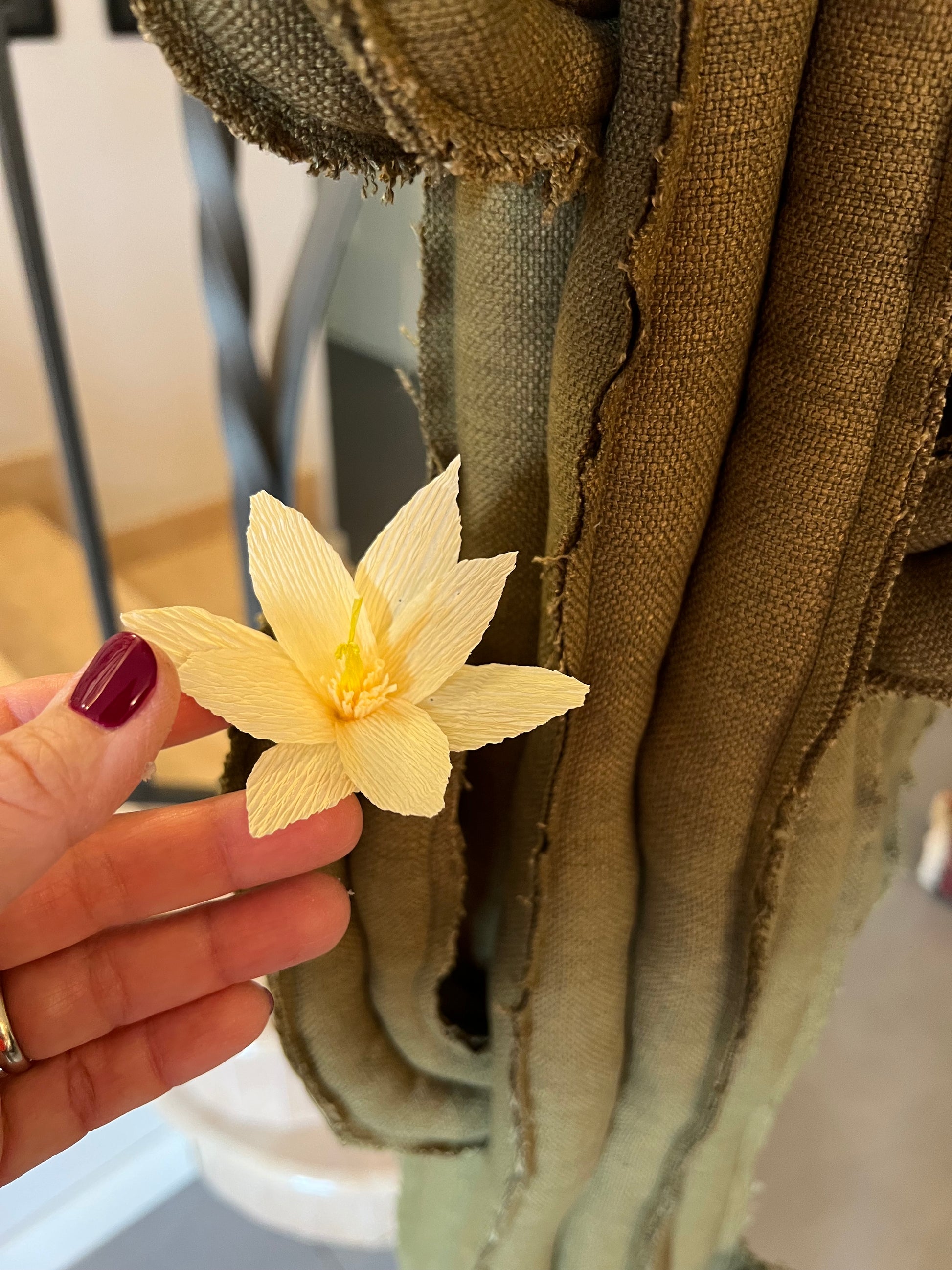 Ogni creazione nasce da tessuti scelti con cura, spesso recuperati, trasformati in piccoli pezzi di natura che durano nel tempo.