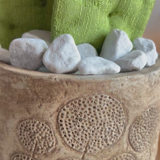Opuntia in wool fabric complete with white ceramic vase and decorative stones.