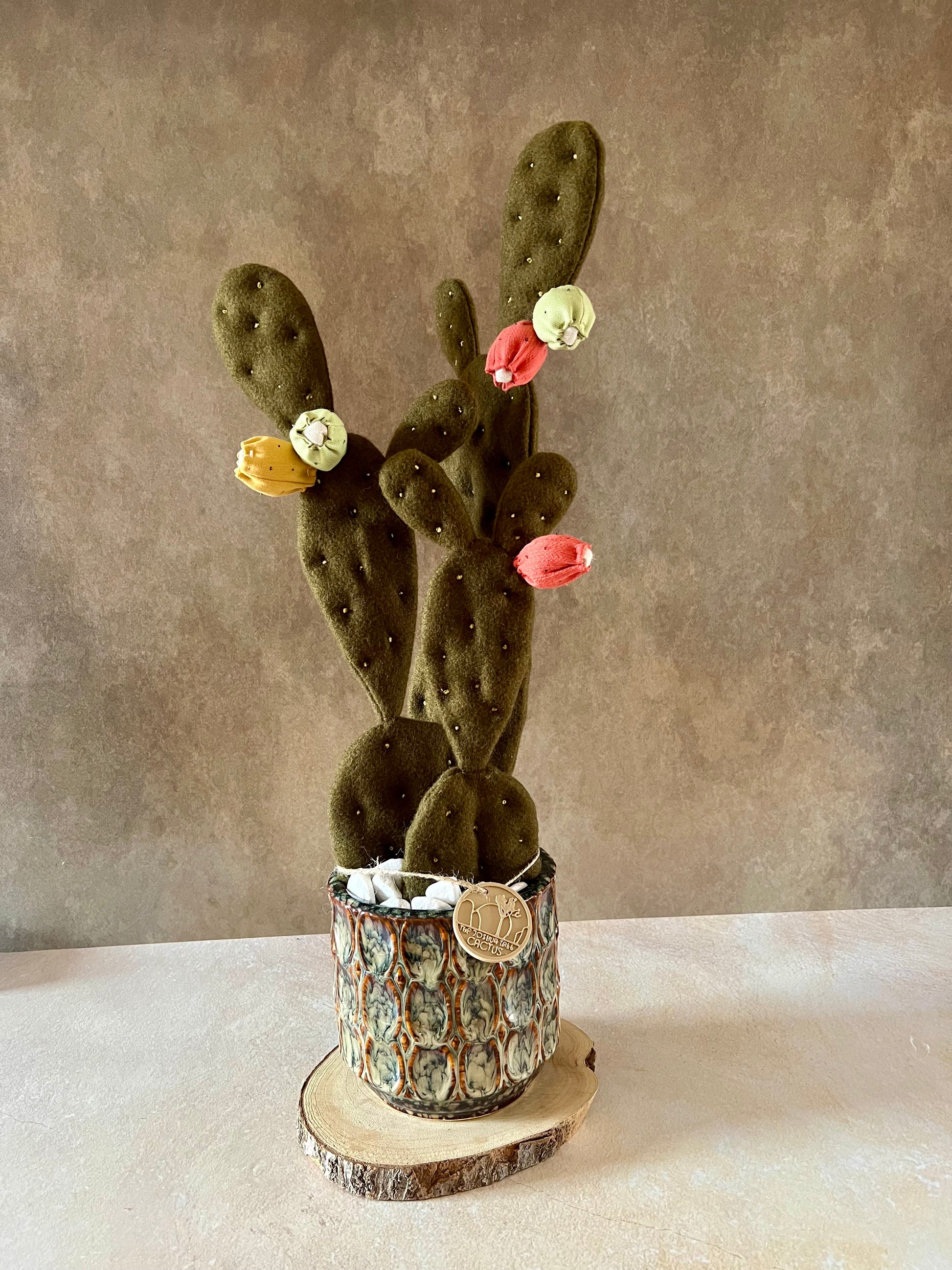 Opuntia in wool fabric complete with white ceramic vase and decorative stones.