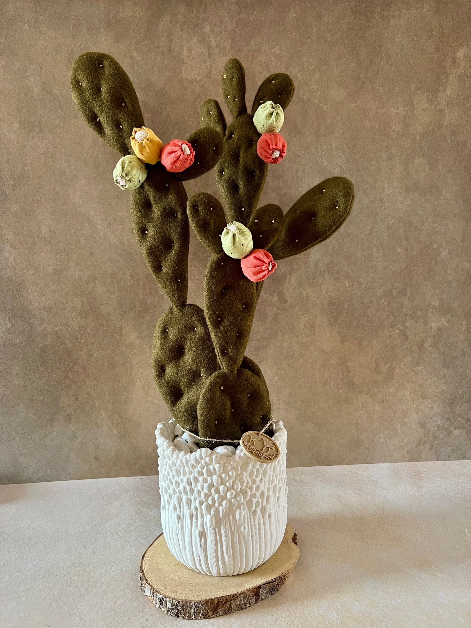 Opuntia in wool fabric complete with white ceramic vase and decorative stones.