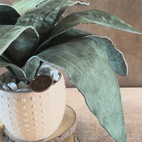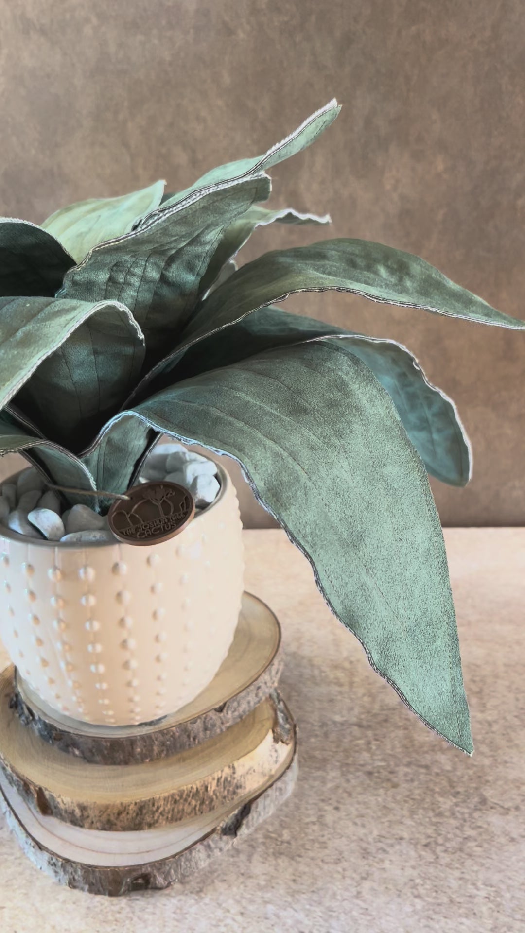 Agave in tessuto artigianale realizzata interamente a mano con morbida alcantara, un materiale che dona profondità e raffinatezza al colore. E' comprensiva di vaso in ceramica beige con motivi puntinati e sassolini decorativi (incollati).