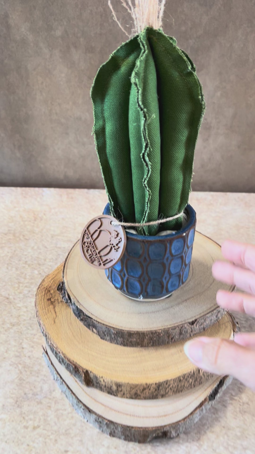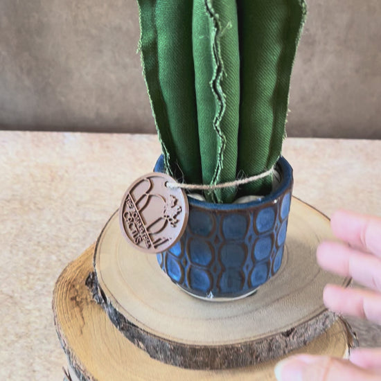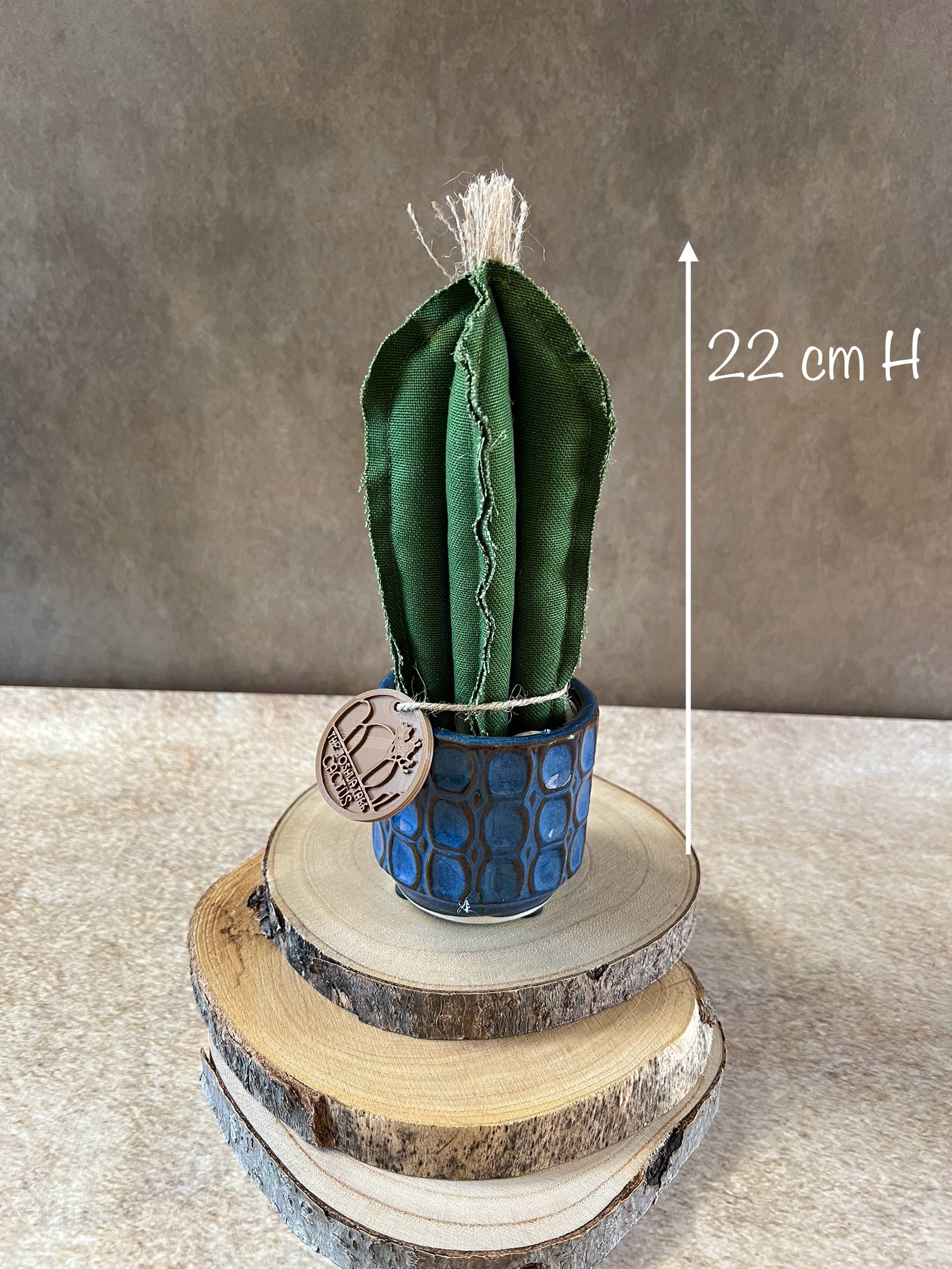 Mini Cactus in cotone verde scuro, vaso in ceramica lucida color blu con motivo geometrico, altezza circa 22 cm.