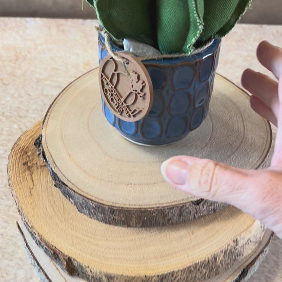 Mini Cactus in cotone verde scuro, vaso in ceramica lucida color blu con motivo geometrico, altezza circa 17 cm.