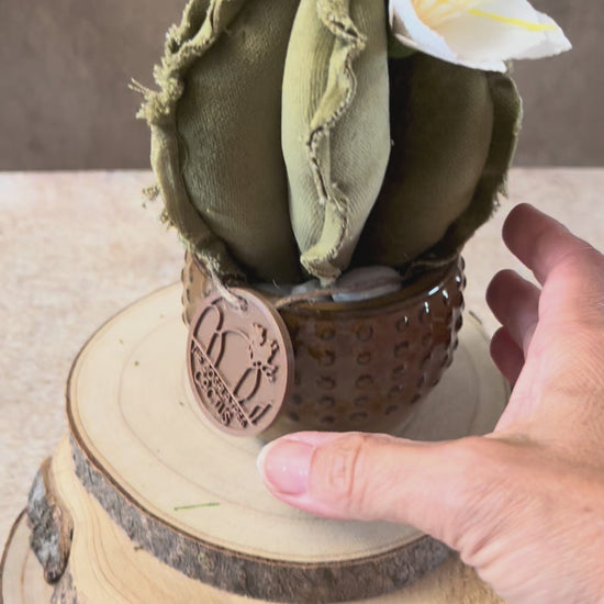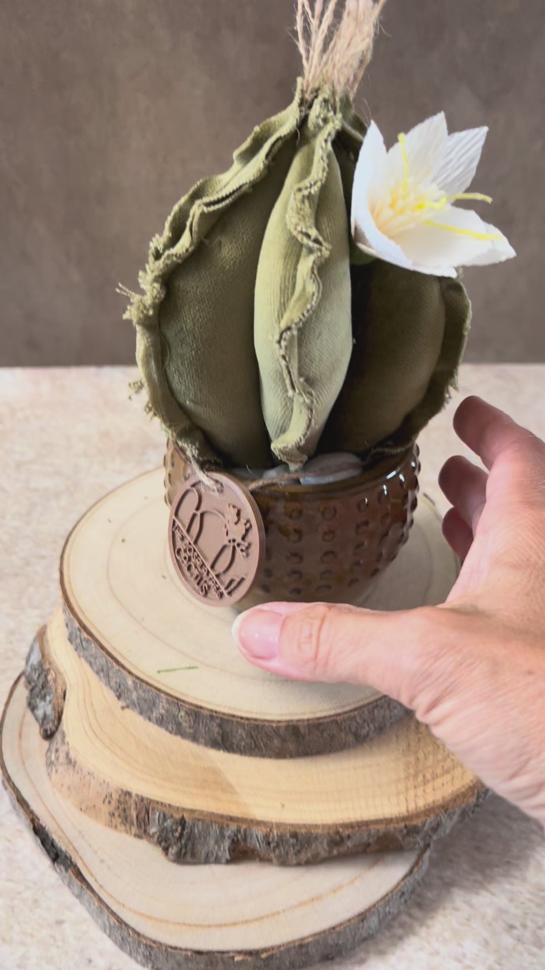 Mini Cactus in velluto verde, vaso in ceramica lucida color marrone con motivo puntinato, altezza circa 19 cm