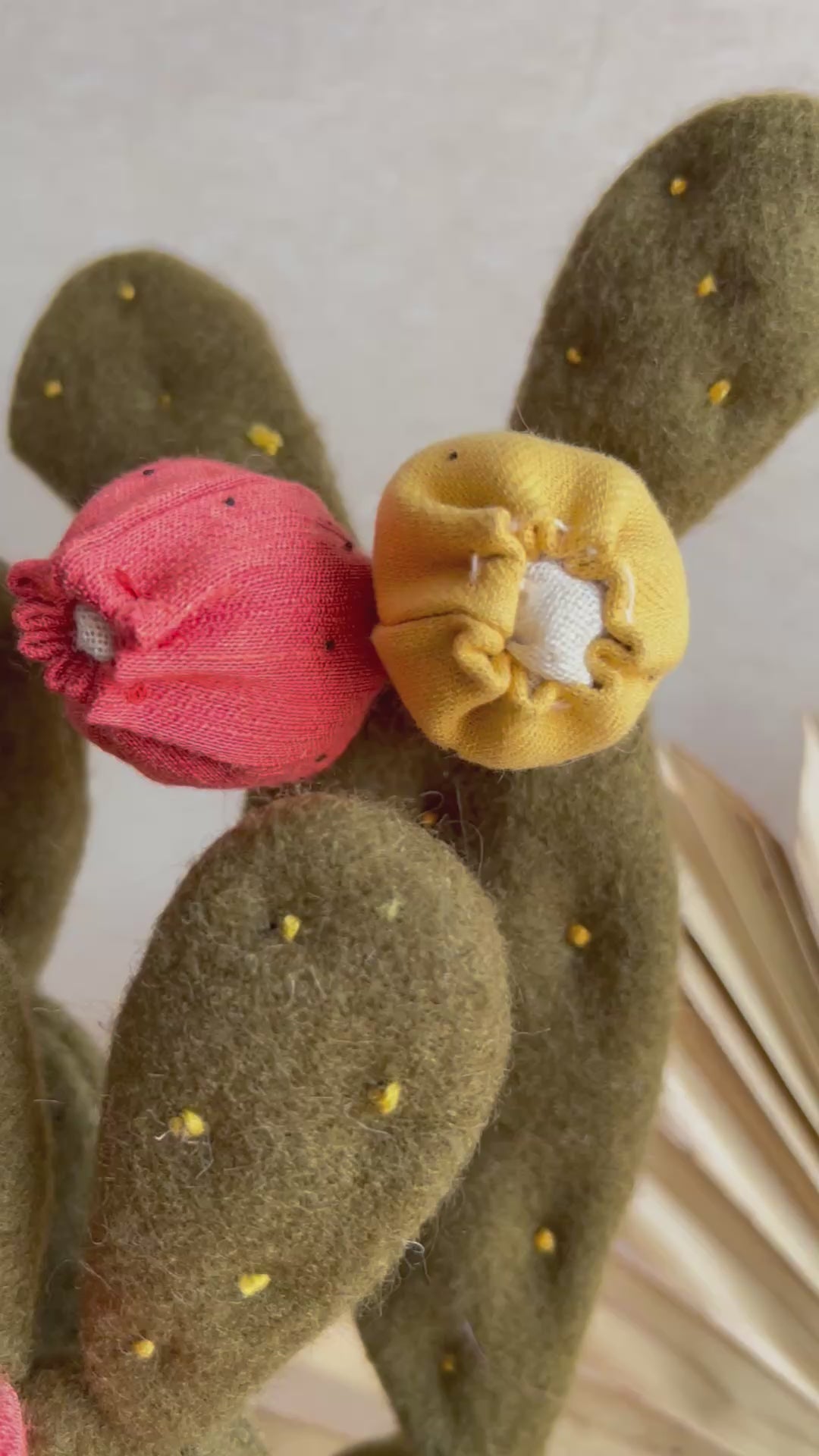 Ogni pala è tagliata e cucita a mano, usando un tessuto di lana  morbido ma deciso. I frutti, in un rosso corallo e giallo, spuntano tra le pale come piccole gemme estive, e rendono questa pianta ancora più viva.