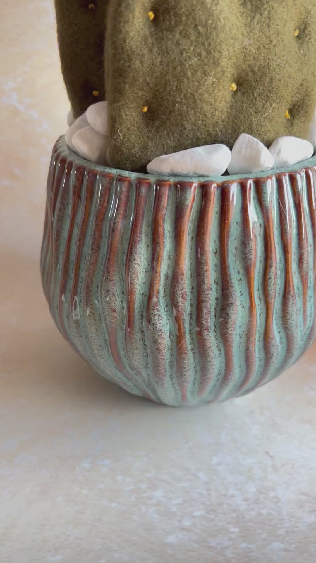 Opuntia in lana verde completo di vaso in ceramica azzurro con striatura marroni  e sassi decorativi, H 50 cm circa.