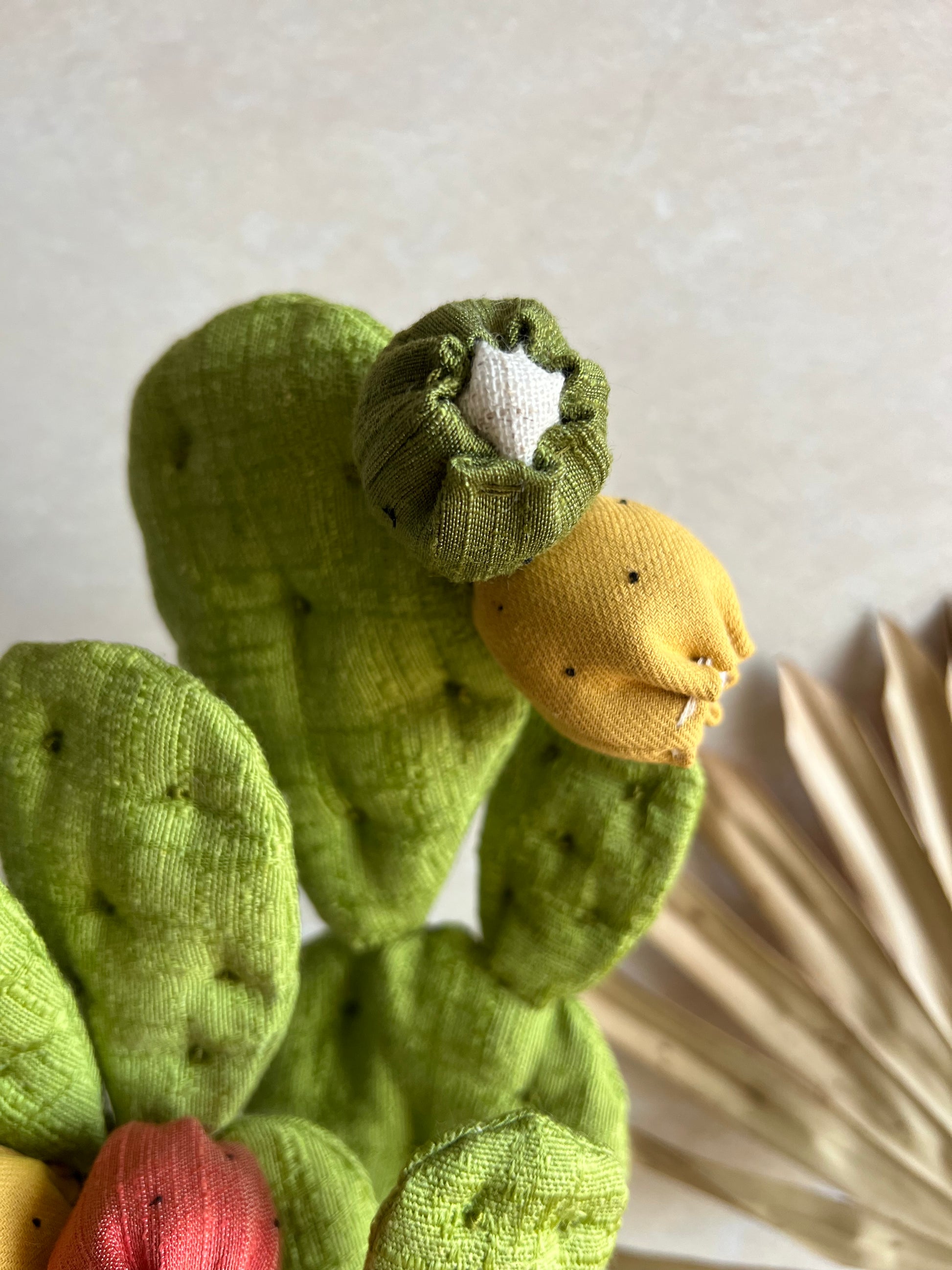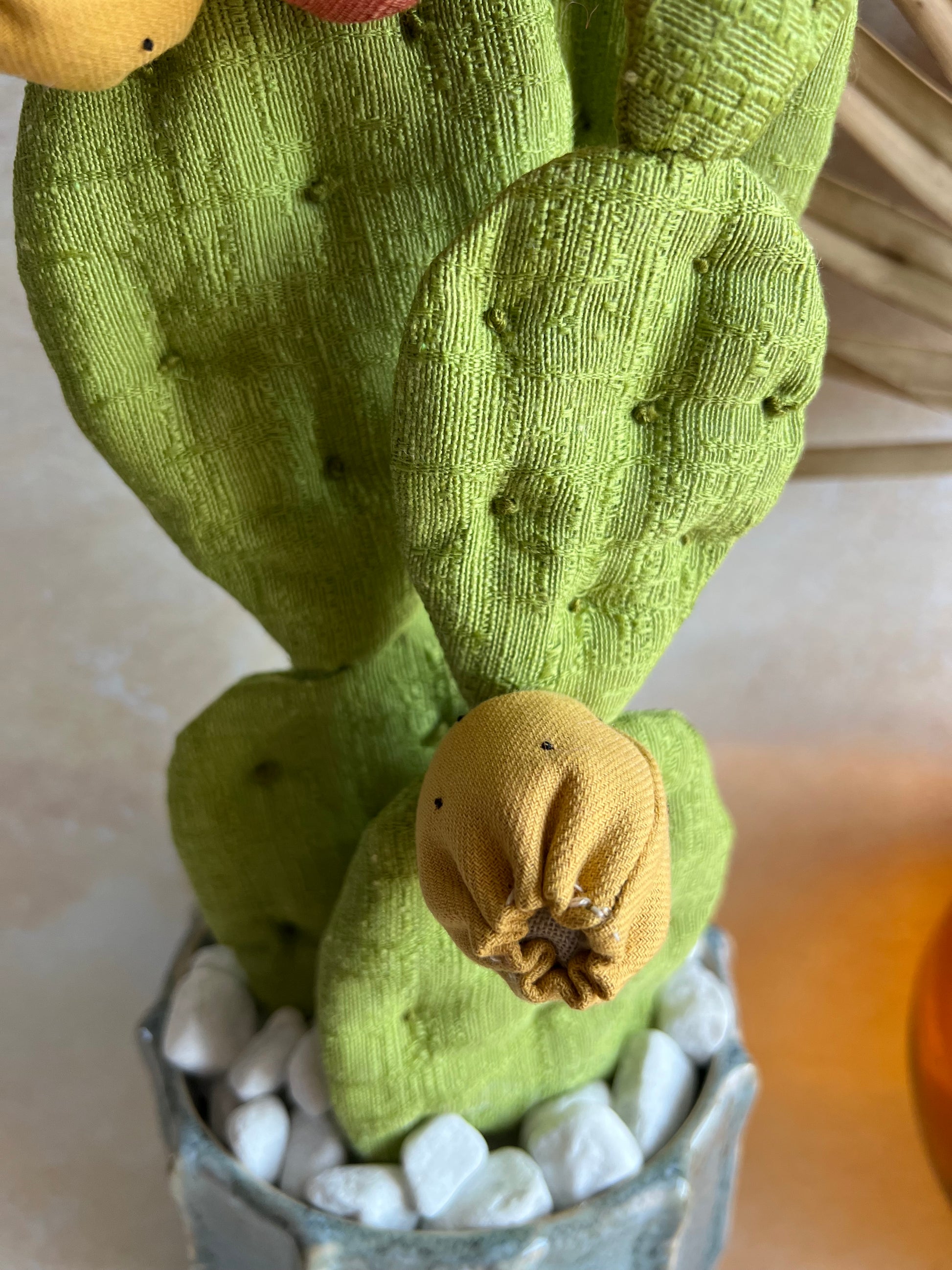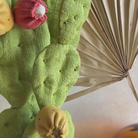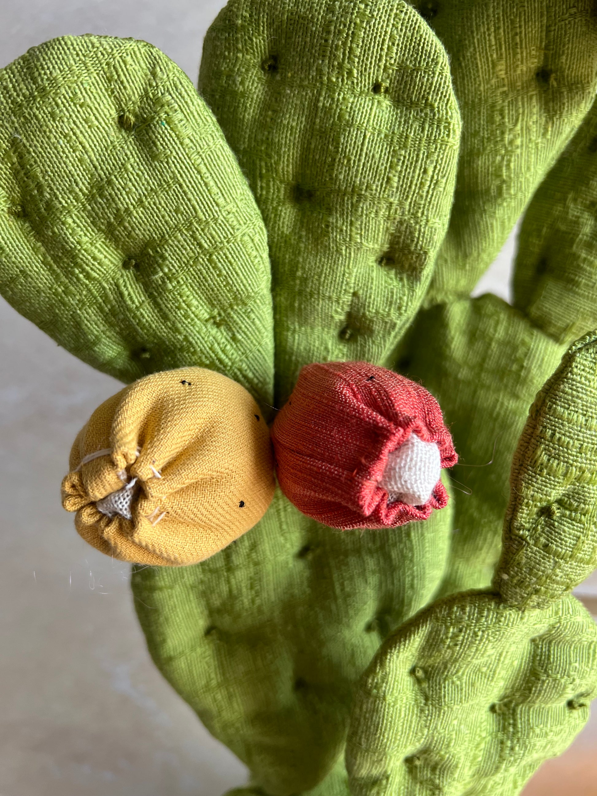 Ogni pala è tagliata e cucita a mano, usando un tessuto di cotone morbido. I frutti, in un rosso corallo e giallo, spuntano tra le pale come piccole gemme estive, e rendono questa pianta ancora più viva.