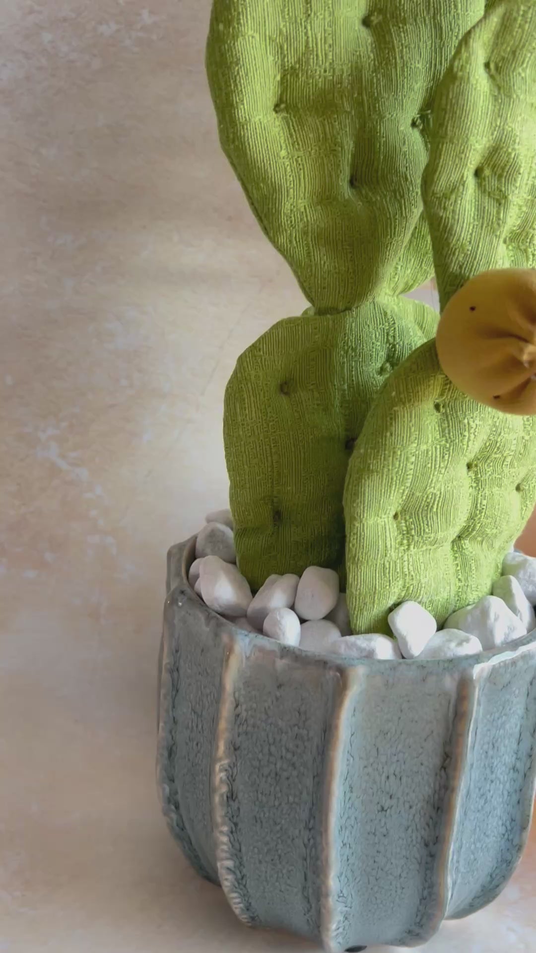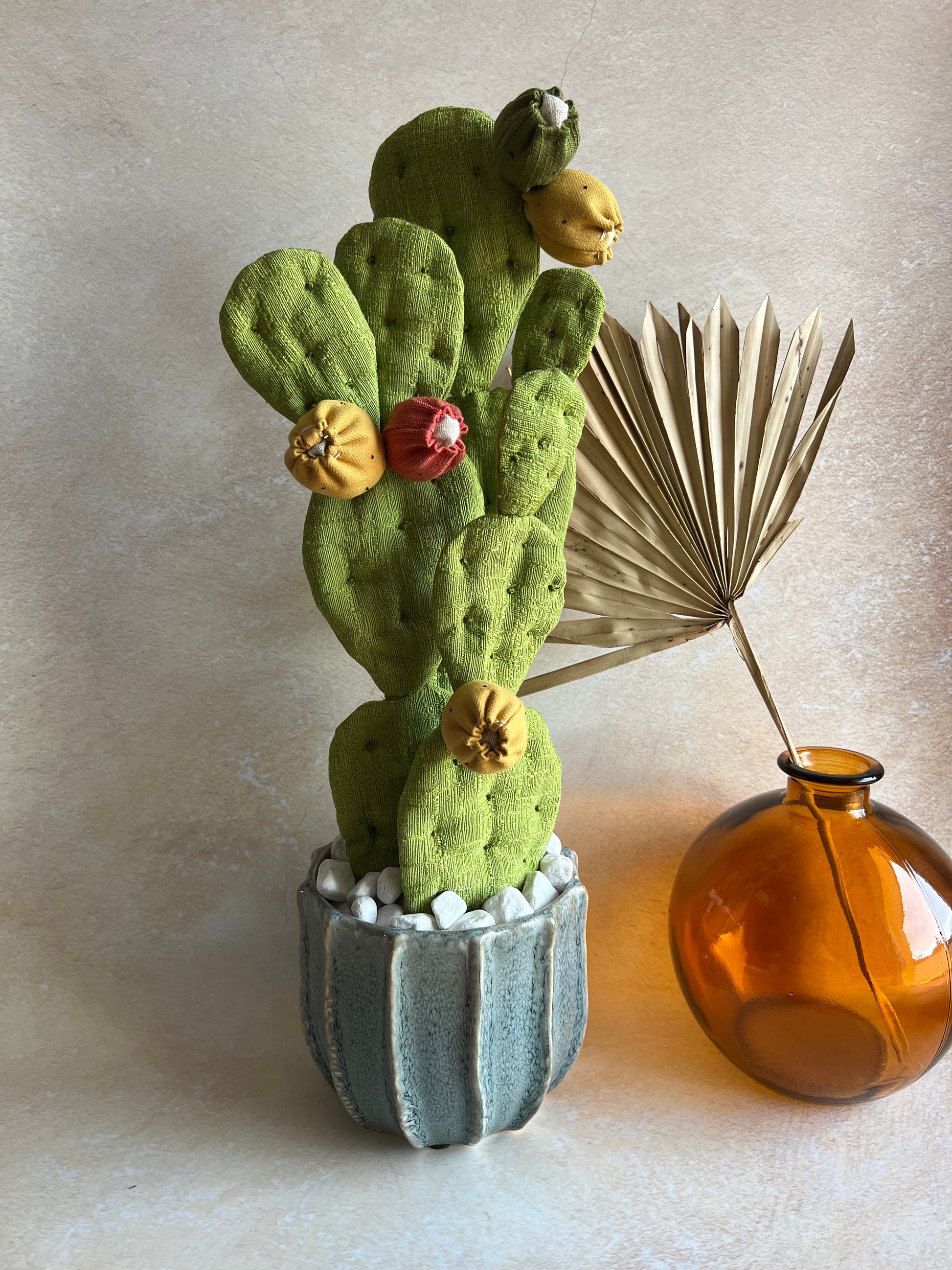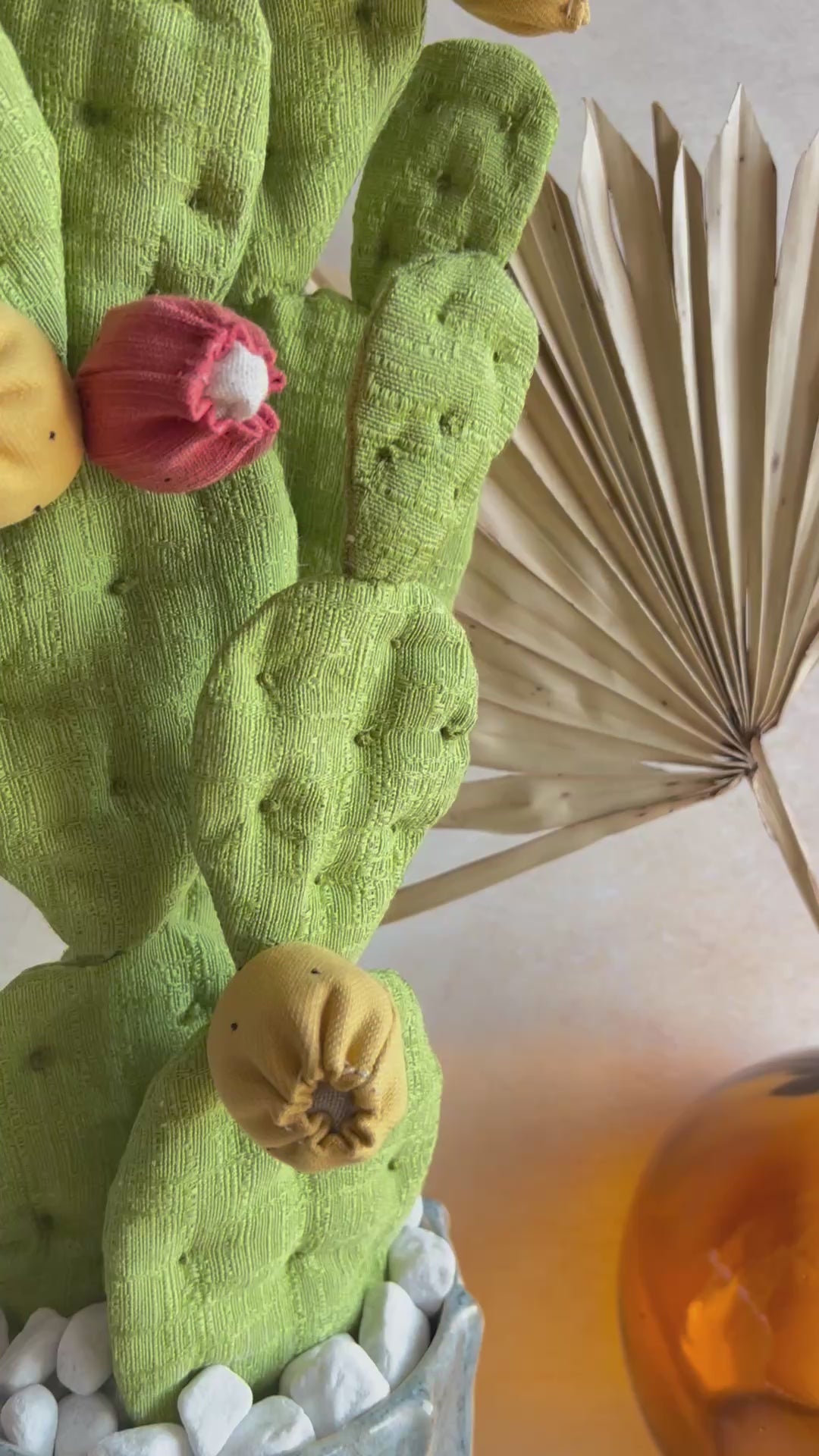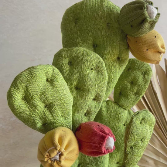 Ogni pala è tagliata e cucita a mano, usando un tessuto di cotone morbido. I frutti, in un rosso corallo e giallo, spuntano tra le pale come piccole gemme estive, e rendono questa pianta ancora più viva.