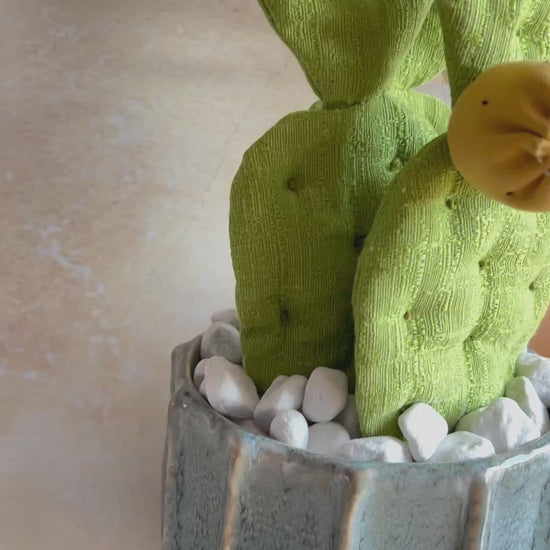Opuntia in cotone verde chiaro completo di vaso in ceramica azzurro e sassi decorativi, H 48 cm.