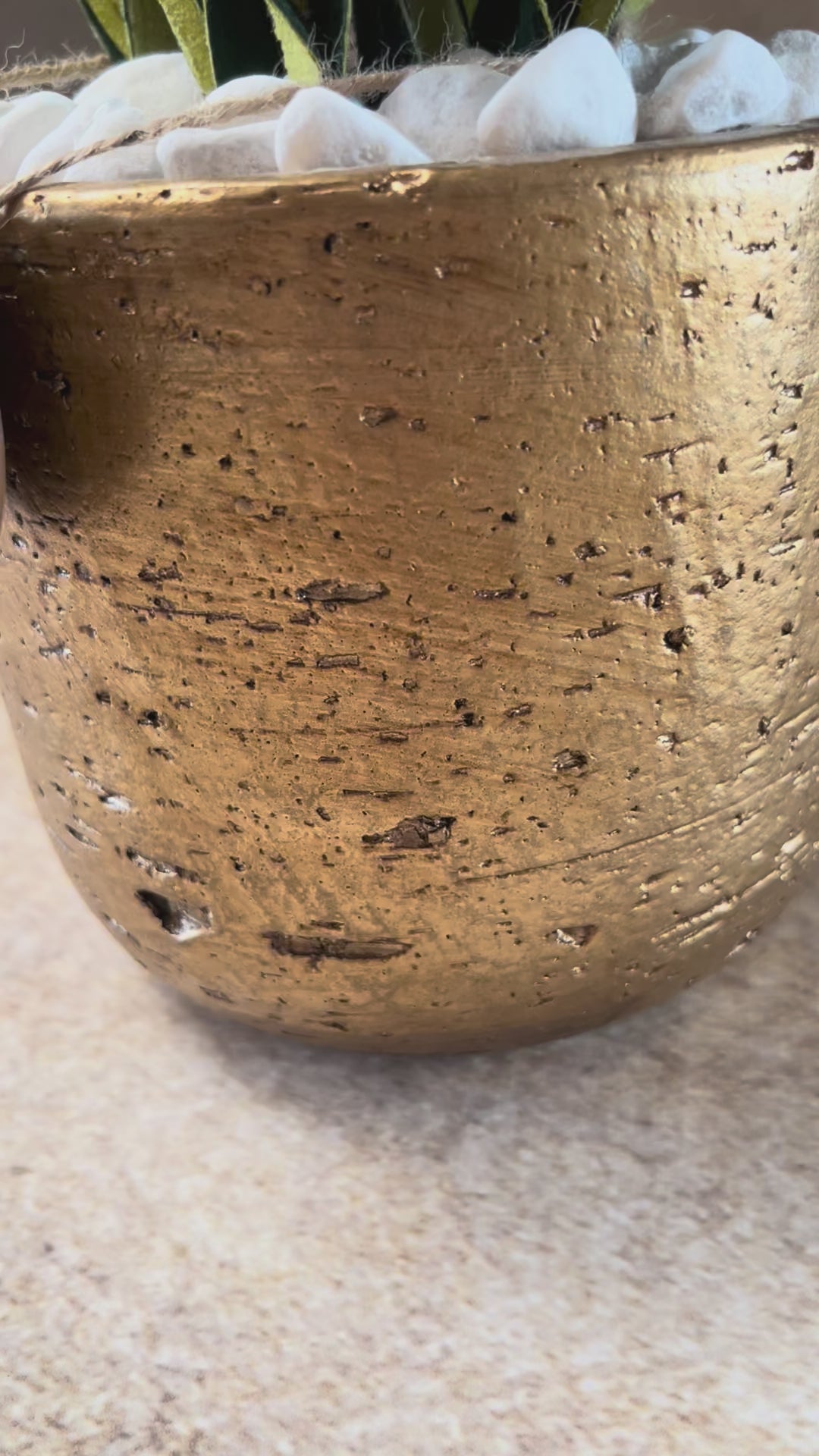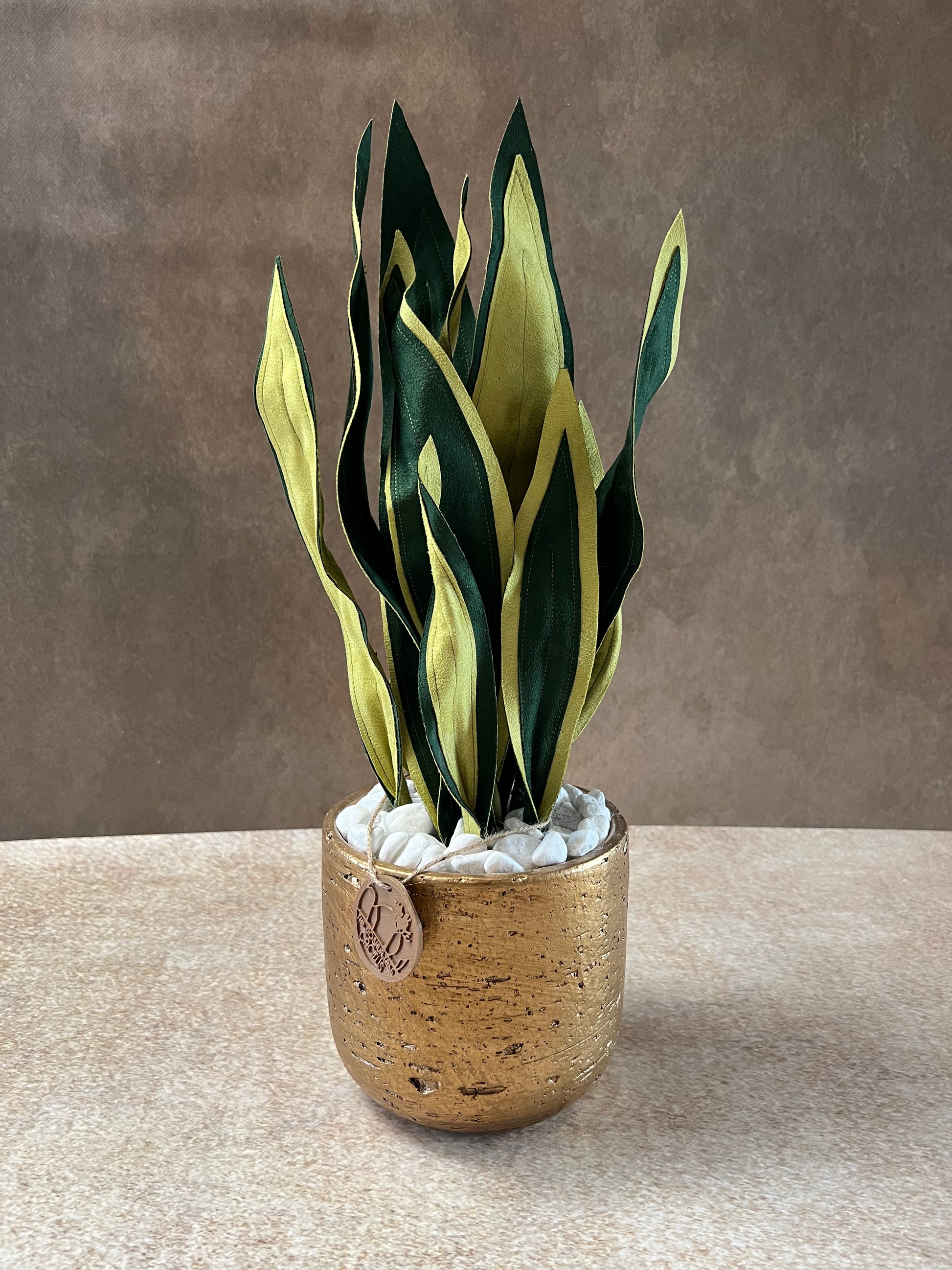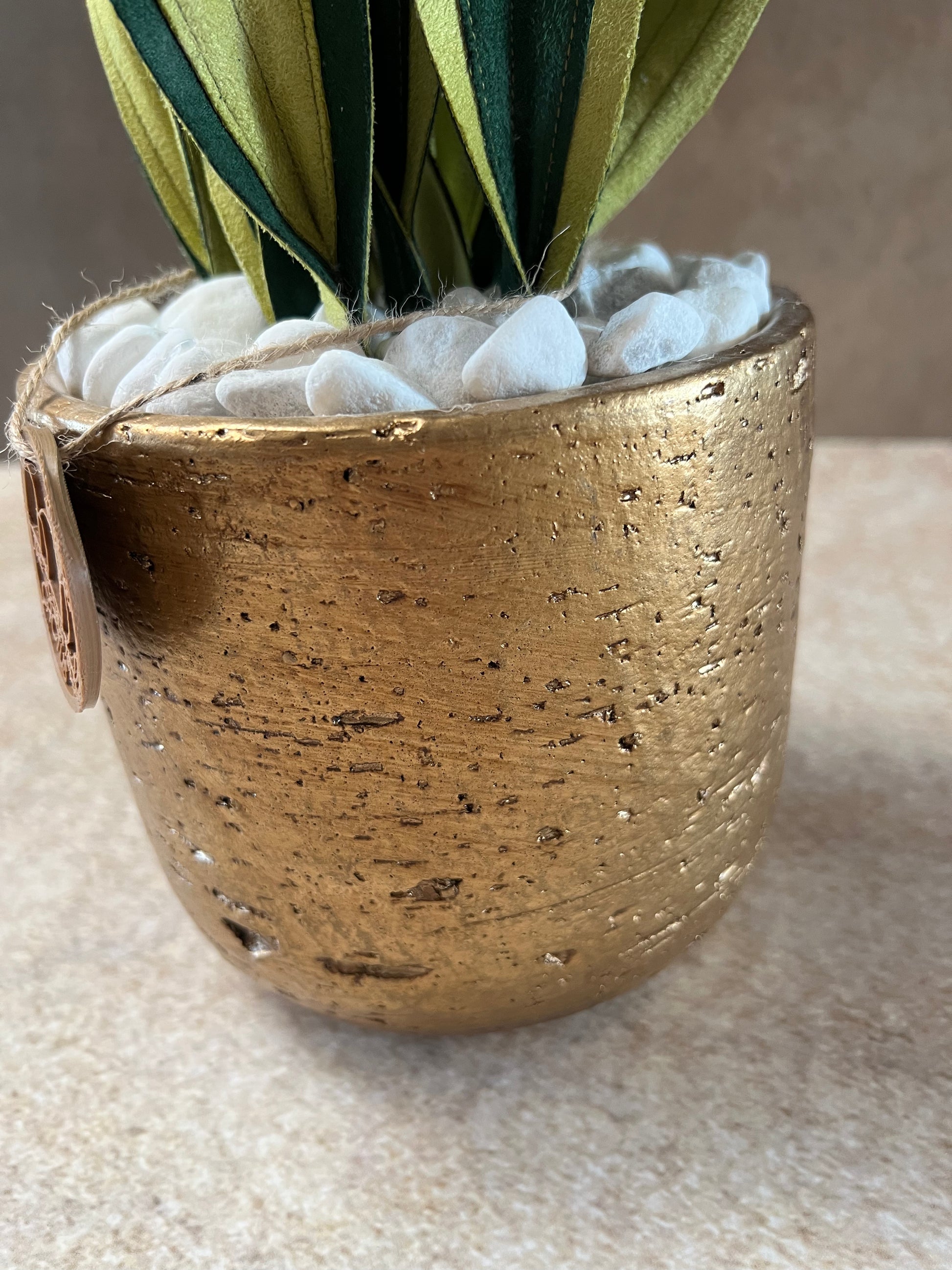 Pianta fatta a mano in tessuto suede (ecopelle scamosciata), completa di vaso in ceramica ORO e sassi decorativi.
